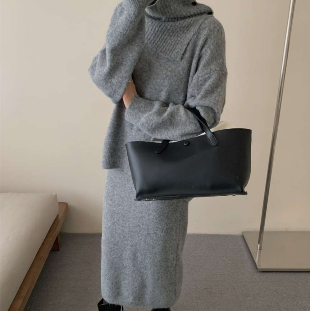 ハイネックデザインとミモレ丈スカートの組み合わせで、落ち着きのある洗練された雰囲気を演出