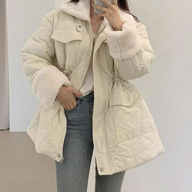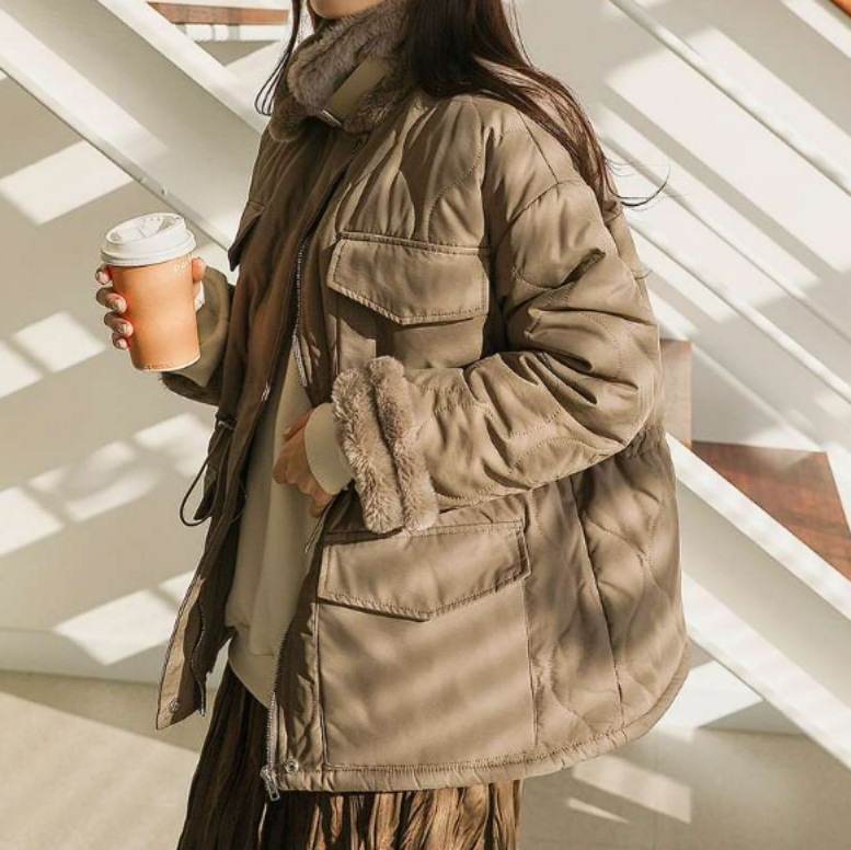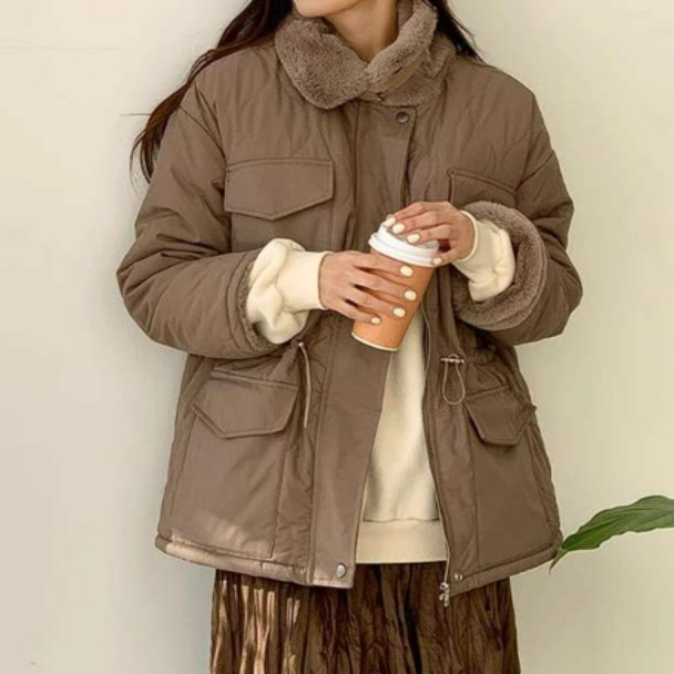 ボリュームのある襟元と裾のドローコードがアクセントの中綿ジャケット♪