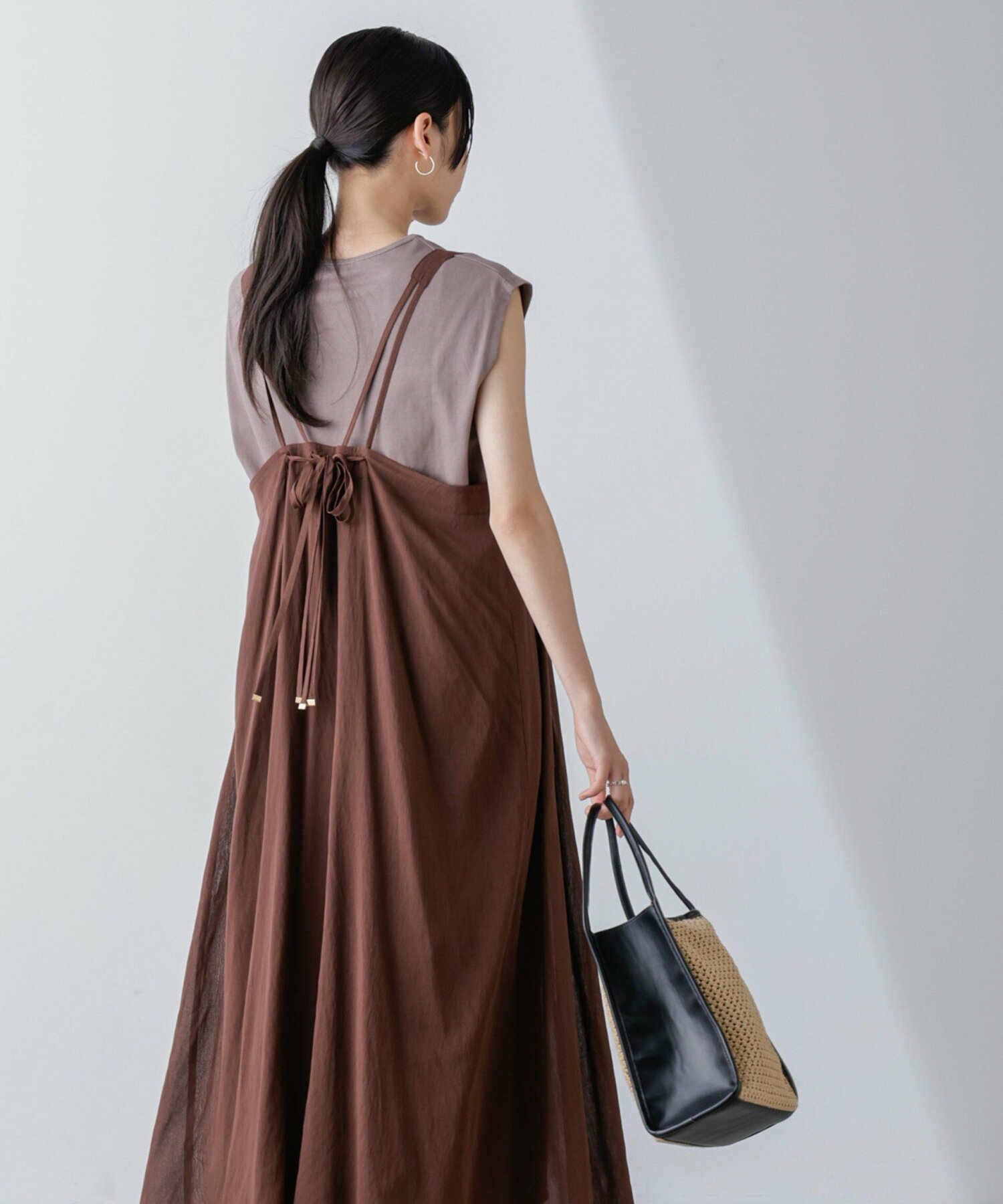 イエベファッションに最適な上品なシャーリングデザインのノースリーブワンピース。